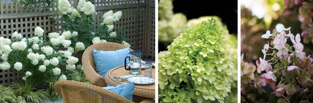 L’hydrangea paniculata, quant à lui, est doté de superbes fleurs en épis. Elles sont blanches et deviennent roses en se fanant. Cette diversité des formes et des couleurs fait que l’on ne se lasse pas des hortensias!